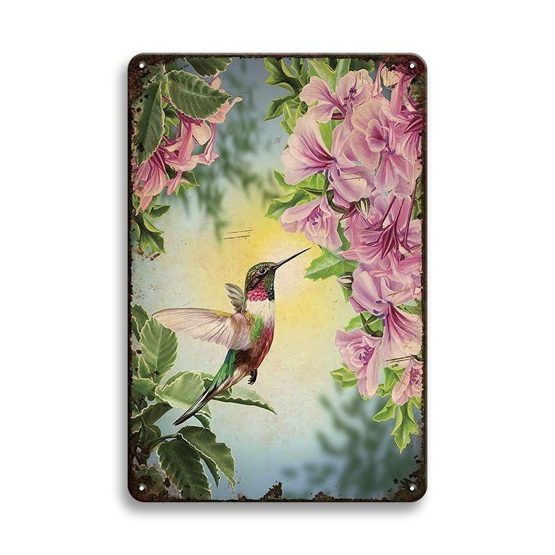 繊細な花々に囲まれて羽ばたくハチドリが描かれた、