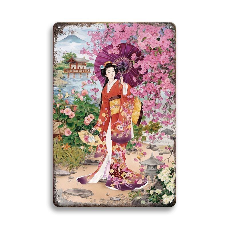 和傘をさした着物姿の美人と満開の桜、日本庭園の風景が美しく描かれたブリキ看板です。