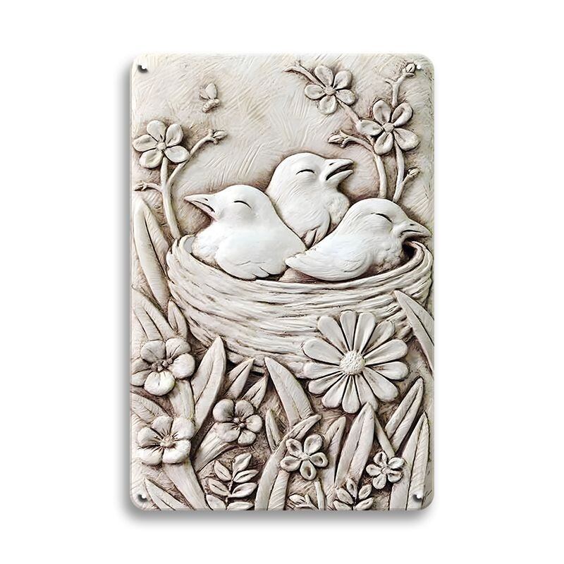 可愛らしい小鳥たちが巣で寄り添う様子を立体レリーフ調で描いたブリキ看板です。
