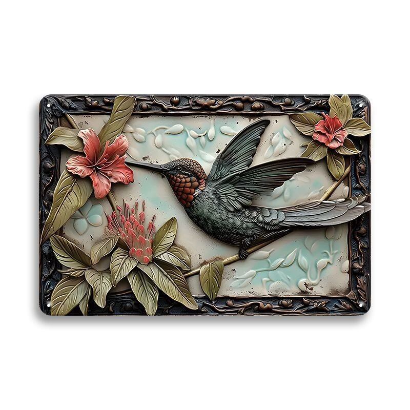 花々の間を舞うハチドリを立体レリーフ風で描いた、重厚感のあるブリキ看板です。