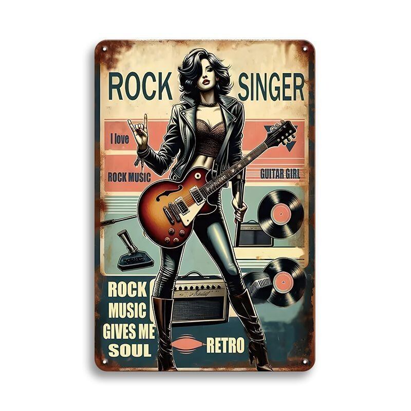 ロックシンガーとエレキギターをモチーフにした、ヴィンテージポスター風デザインのブリキ看板です。