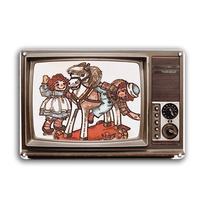 レトロなブラウン管テレビとビンテージ風イラストが描かれたブリキ看板です。