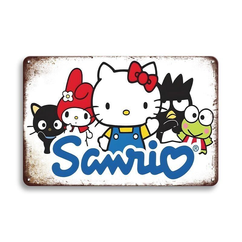 サンリオの人気キャラクターが集合した、ポップで可愛いデザインのブリキ看板です。