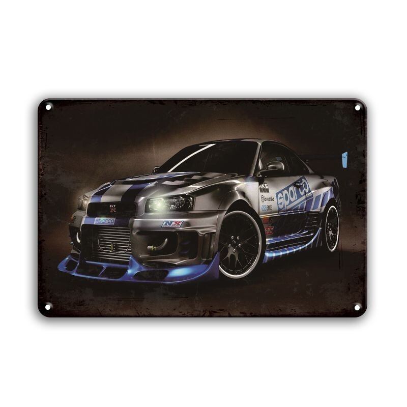 レーシング仕様のスポーツカーがクールに描かれた、迫力のあるデザインのブリキ看板です。
