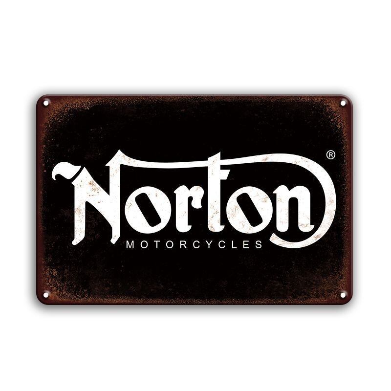 ノートンモーターサイクルのロゴデザインが映えるブリキ看板です。