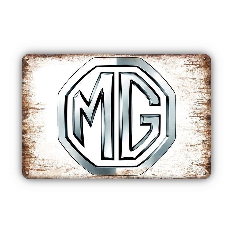 英国車ブランドMGのロゴをモチーフにしたブリキ看板です。
