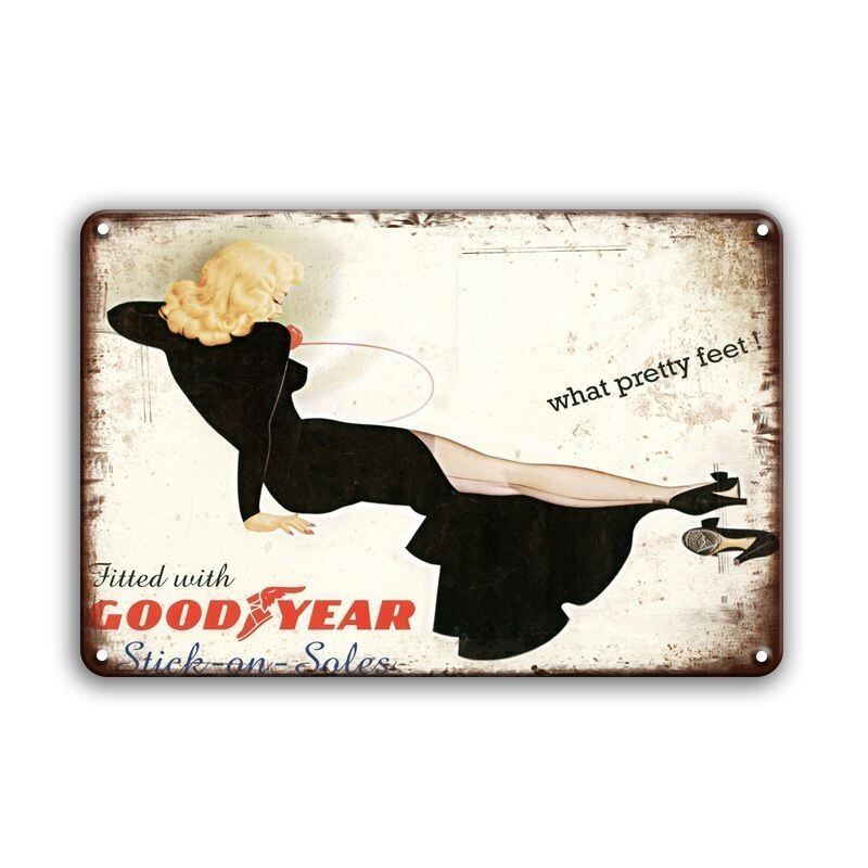 Goodyearデザインのレトロなピンナップアート風ブリキ看板です。