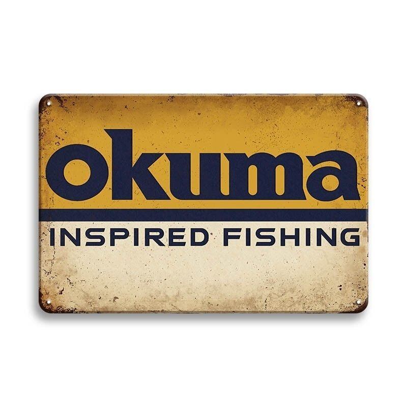 okumaのフィッシングデザインが描かれたレトロテイストのブリキ看板です。