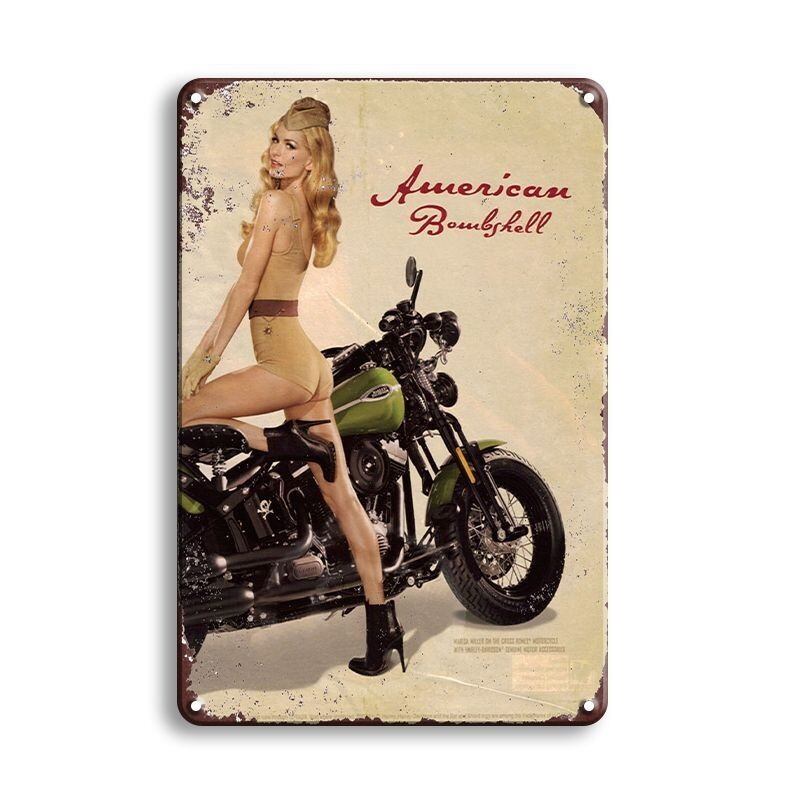 American Bombshellデザインのピンナップガールとバイクが描かれたブリキ看板です。