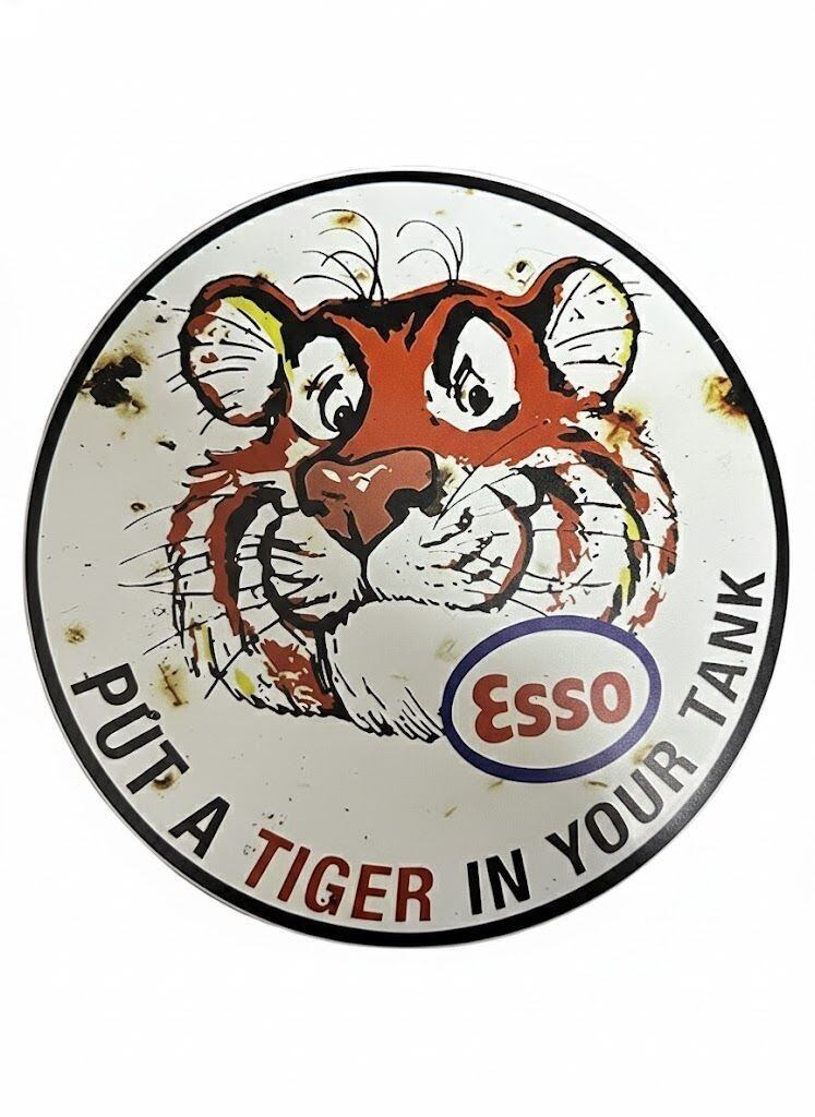 エッソのタイガーデザインが印象的な丸型ブリキ看板です。
