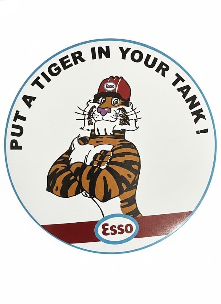 エッソのタイガーキャラクターが描かれた丸型ブリキ看板です。