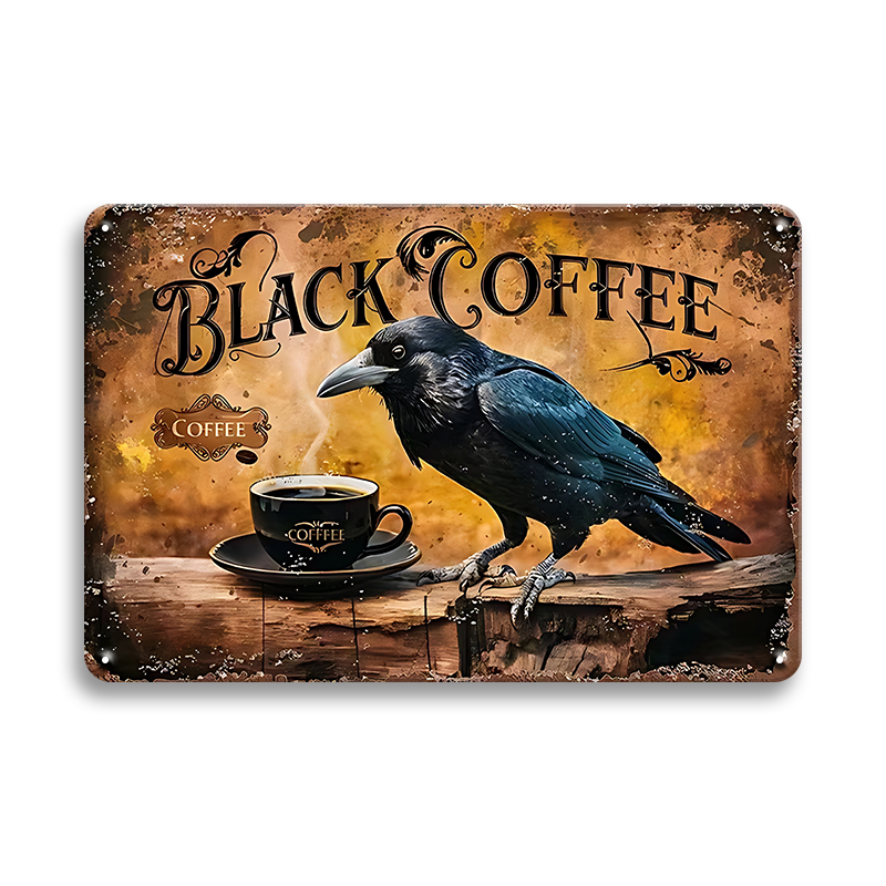 カラスとコーヒーカップが描かれたアートデザインで、カフェ風インテリアやお店のディスプレイにもぴったりです。