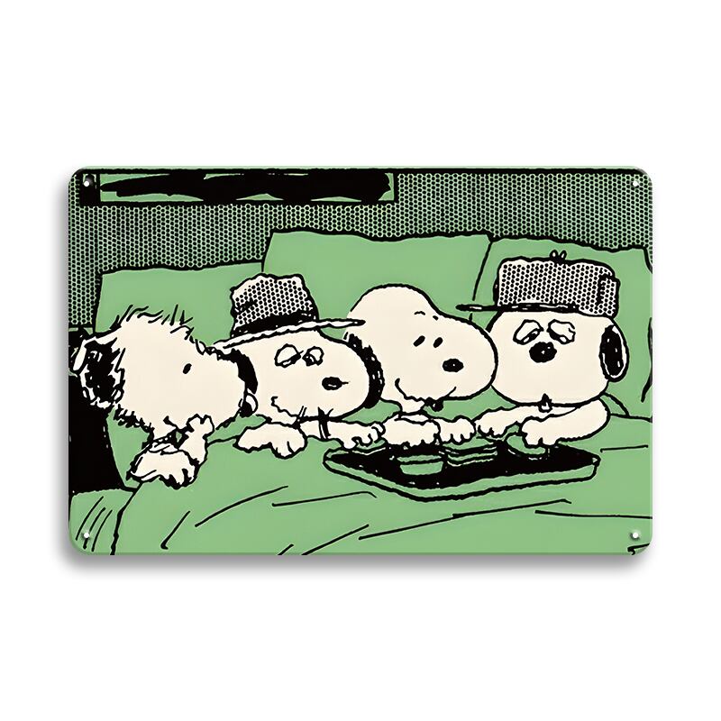 可愛いスヌーピーたちが描かれたレトロデザインのブリキ看板です。