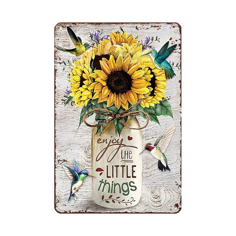 鮮やかなひまわりと可愛らしいハチドリが描かれた、温かみのあるブリキ看板です。