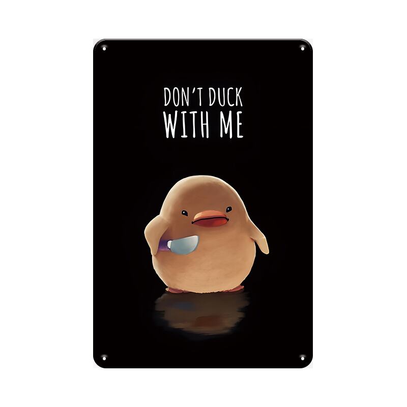 可愛らしいアヒルのキャラクターが描かれたユニークなブリキ看板です。