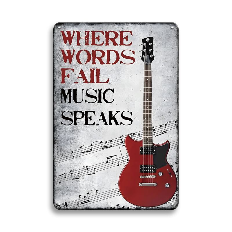 「WHERE WORDS FAIL MUSIC SPEAKS」のメッセージとギターのデザインが印象的で、空間をセンス良く演出します。