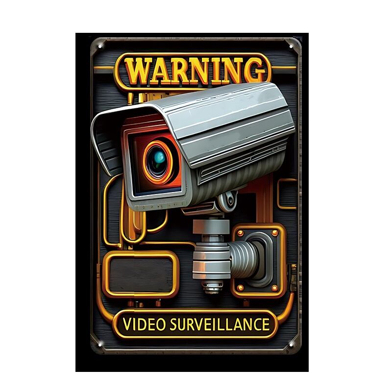 「WARNING」「VIDEO SURVEILLANCE」の文字が目を引き、防犯対策やインテリアとしてもおすすめです。