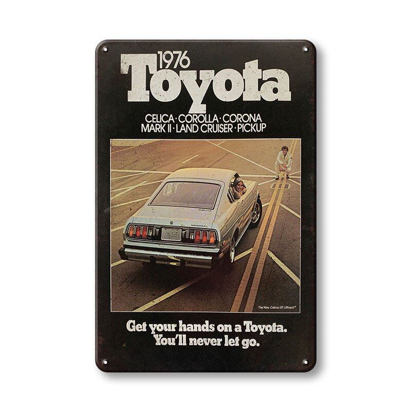 1976年のトヨタ広告デザインが描かれた、レトロでおしゃれなブリキ看板です。