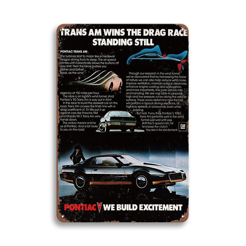 ポンティアック・トランザムのクラシックな広告デザインが魅力のブリキ看板です。