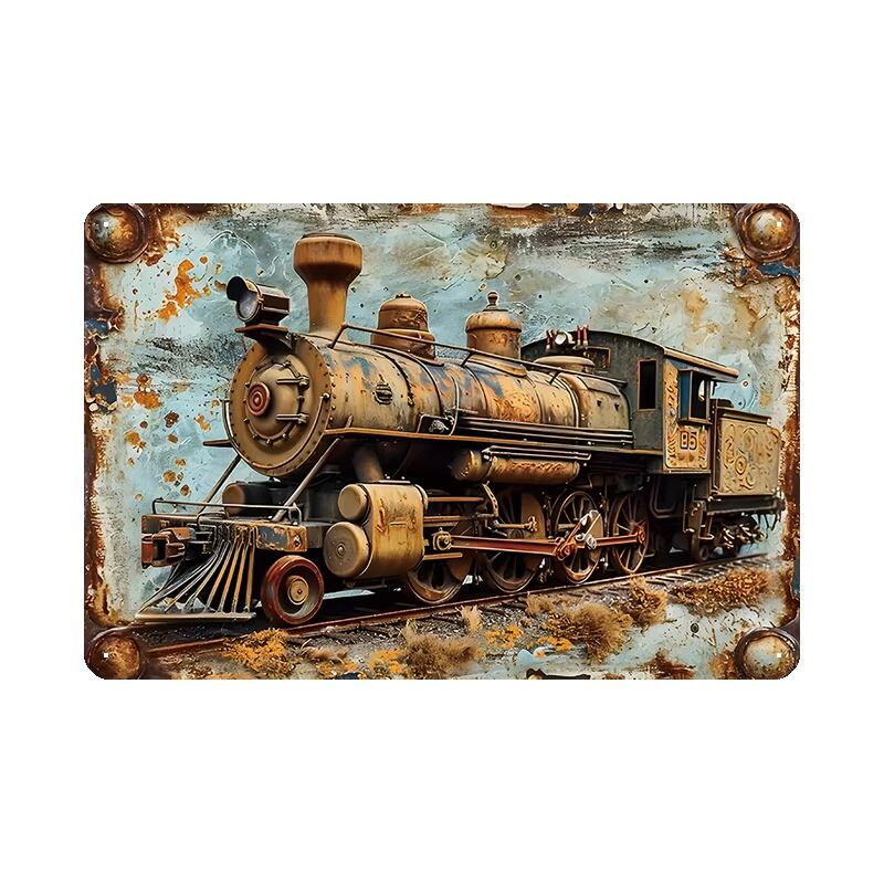 重厚感あふれる蒸気機関車が描かれたレトロデザインのブリキ看板です。