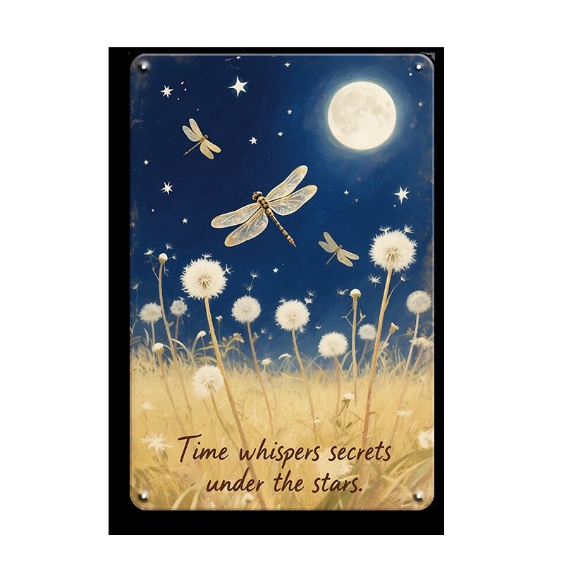 幻想的な夜空と月明かりに照らされたたんぽぽ畑とトンボが描かれた、美しいブリキ看板です。