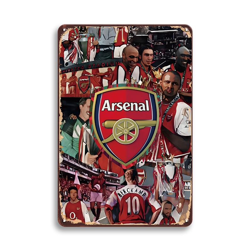 アーセナルのロゴと名シーンがデザインされた、存在感抜群のブリキ看板です。