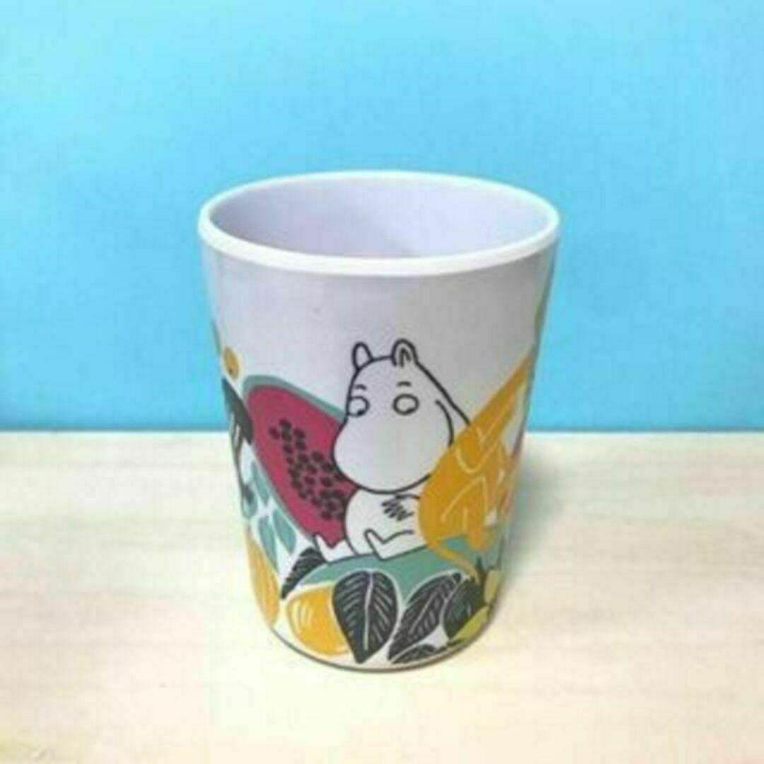 カラフルなパパイヤやブドウなどの果物と一緒にムーミンキャラが描かれています。