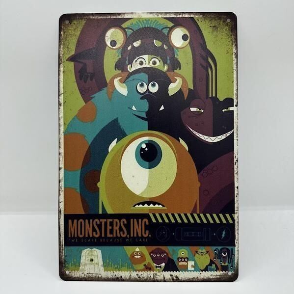 このレトロなブリキ看板は、ディズニー映画「モンスターズインク」の人気キャラクターたちがデザインされたアイテムです。