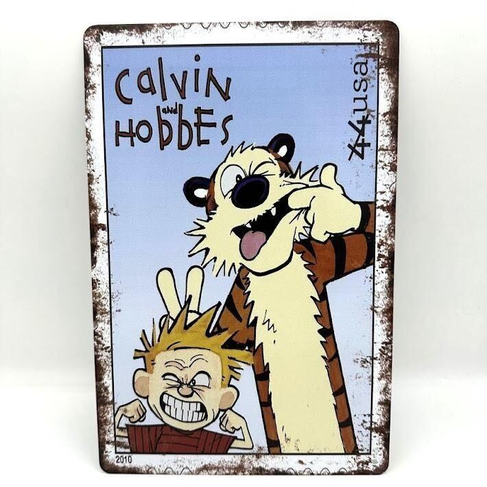 人気コミック「Calvin and Hobbes」のキャラクターが描かれたブリキ看板です。カルビンとハーボが楽しそうにふざけ合う姿がデザインされており、ユーモア溢れる表情が魅力的です。ヴィンテージ風のデザインで、お部屋や書斎、オフィスのインテリアに最適です。