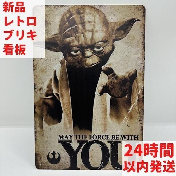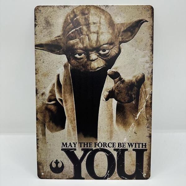 スター・ウォーズシリーズでお馴染みのヨーダが描かれたレトロなブリキ看板です。ヨーダの名台詞「May the Force be with You」がデザインされています。ヴィンテージ風の仕上がりで、お部屋のインテリアやコレクションとして最適です。