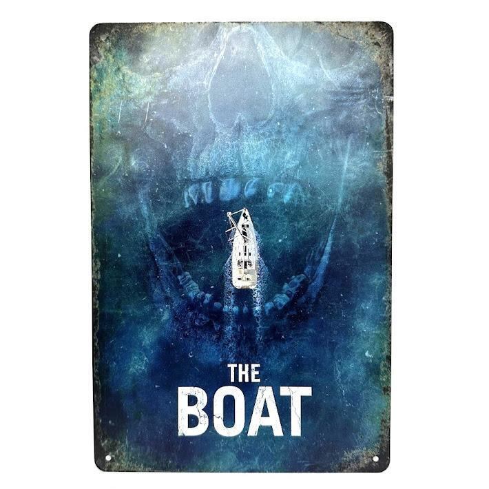 The Boat"のホラー映画風ポスターをモチーフにしたレトロなブリキ看板です。深海の中で不気味に浮かび上がるスカルと船のデザインが、ミステリアスで魅力的な雰囲気を醸し出します。ホラー映画ファンやインテリアとしてのアクセントを求める方にぴったりのアイテムです。