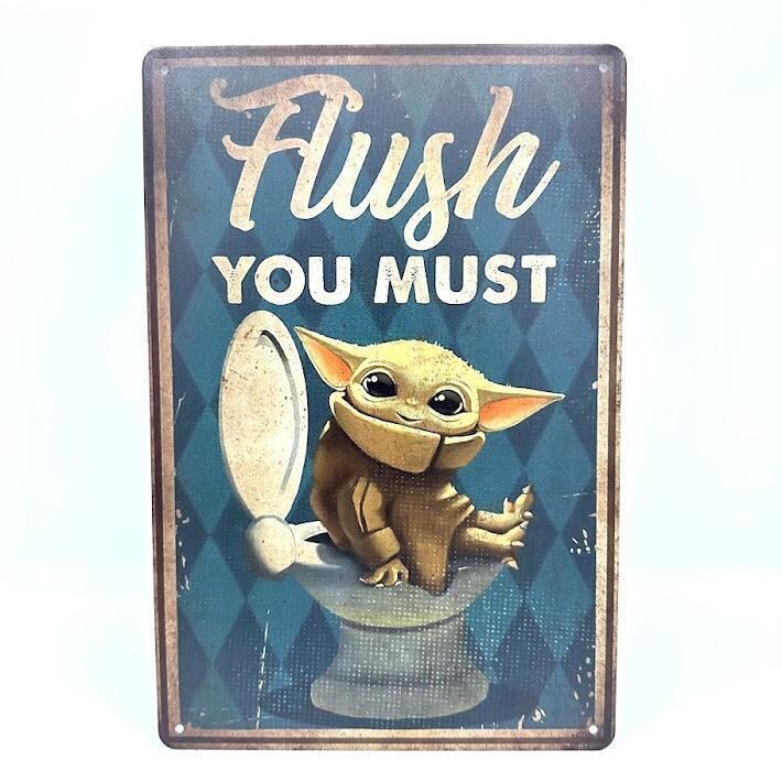 ユニークでキュートなキャラクターが描かれた「Flush You Must」ブリキ看板です。トイレマナーを楽しく伝えるデザインで、キャラクターが便器に座っている様子がユーモラスに描かれています。お子様にも親しみやすく、トイレやバスルームのインテリアに最適です。