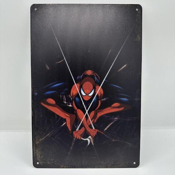 スパイダーマンがクモの糸を操り、アクションを決める姿を描いたブリキ看板です。暗い背景に浮かび上がるスパイダーマンの赤と青のコスチュームが印象的で、スパイダーマンの躍動感を感じさせるデザインが特徴です。スパイダーマンファンやマーベルコミックスのコレクターにとって、絶対に見逃せないアイテムです。お部屋やオフィスのインテリアとしても最適です。