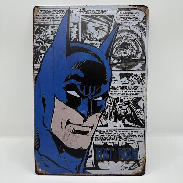 このブリキ看板は、DCコミックスのダークナイト、バットマンのシンボル的なコミックアートをフィーチャーしています。背景には、クラシックなコミックパネルが描かれており、ファンにとっては懐かしいデザインです。ヴィンテージ風のテイストが施されており、インテリアとしてもおしゃれなアイテムです。