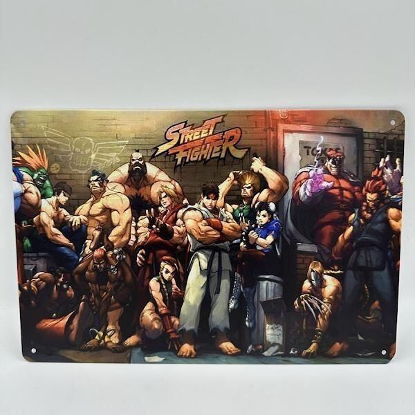 このストリートファイターのブリキ看板は、クラシックなキャラクターたちが一堂に会したデザインで、ゲームファンにはたまらない一品です。