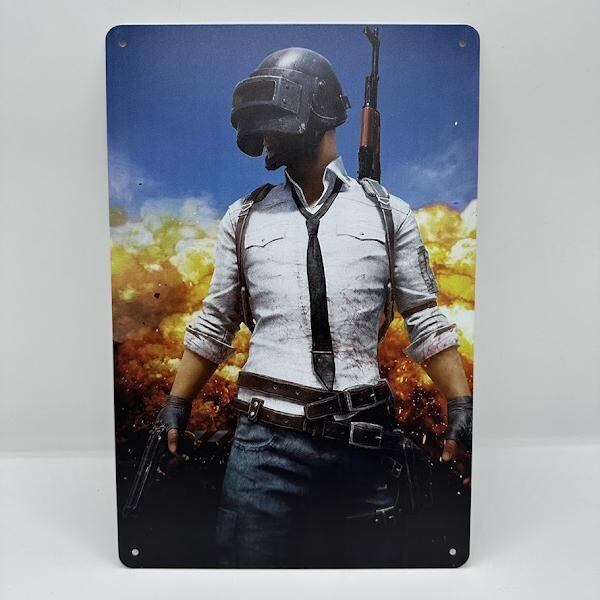 このブリキ看板は、人気ゲーム「PUBG」をテーマにしたデザインです