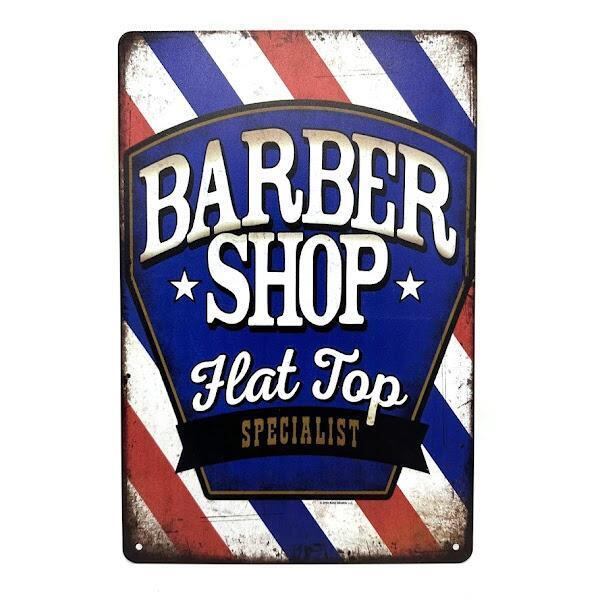 このブリキ看板は、クラシックなバーバーショップをテーマにしたデザインです。