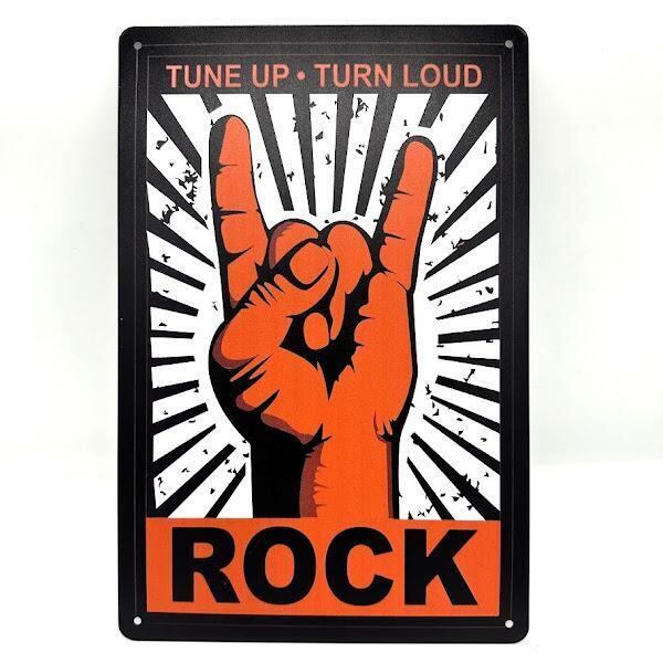 このブリキ看板は、ロックミュージック愛好者にぴったりのデザインです。