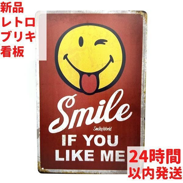 このブリキ看板は、ウィンクするスマイリーが「Smile If You Like Me」とユーモアを添えたデザインです。
