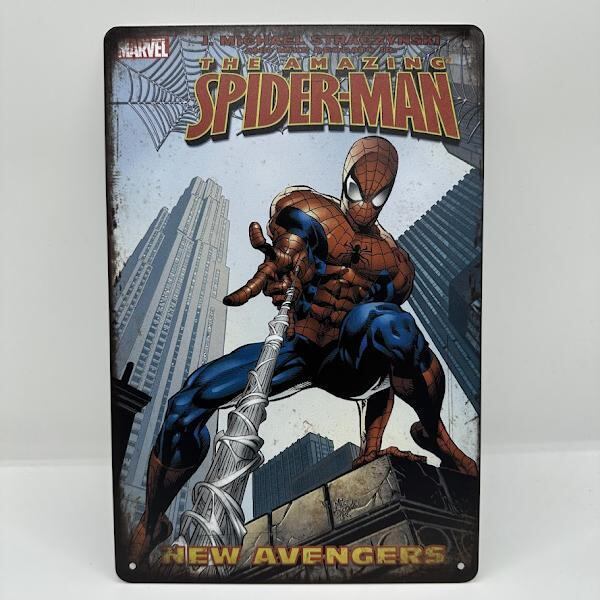 スパイダーマンが活躍するシーンを描いたレトロなブリキ看板です。ニューヨークの高層ビル群を背景に、スパイダーマンがウェブを放つ姿が印象的に描かれています。ヴィンテージ風のデザインが特徴で、どんな場所にもユニークなアクセントを加えます。コレクターやファンの方へのプレゼントとしても最適です。