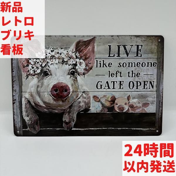 このブリキ看板は、かわいらしい豚のイラストと「LIVE like someone left the GATE OPEN」のメッセージが特徴です。