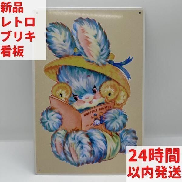 このブリキ看板は、可愛らしいバニーが絵本を読むデザインが特徴です。