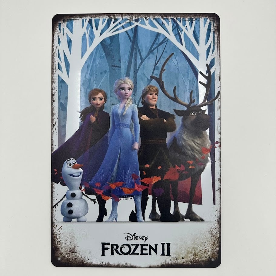 ディズニー映画「アナと雪の女王2」の主要キャラクターが集合したブリキ看板です。