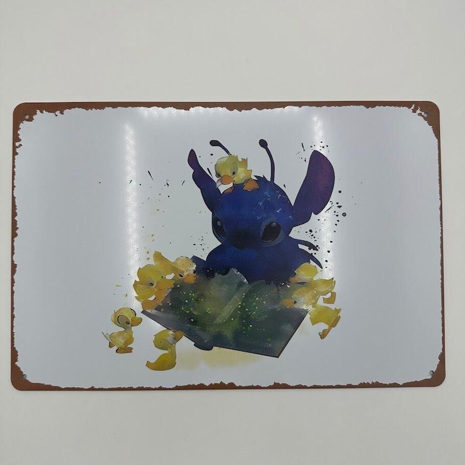 ディズニー映画「リロ&スティッチ」のスティッチがひよこと一緒に描かれた愛らしいデザインのブリキ看板です。